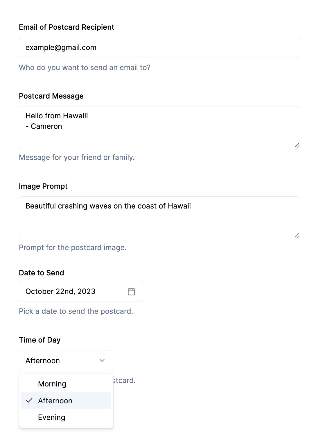 1. A user fills out a form with an email address for the recipient, a body message for the email, a prompt for the image, and sets a date and a time of day to send the postcard.