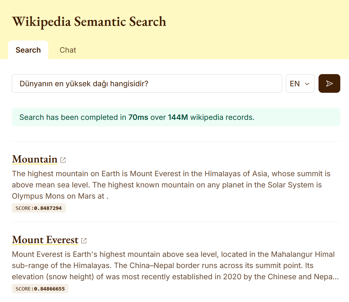 The first observation is that the BGE-M3 model is cross-lingual. It is impressive to see a query text written in Turkish, such as Dünyanın en yüksek dağı hangisidir? (which translates to Which is the highest mountain in the world?), can return accurate results when run against the English Wikipedia namespace.