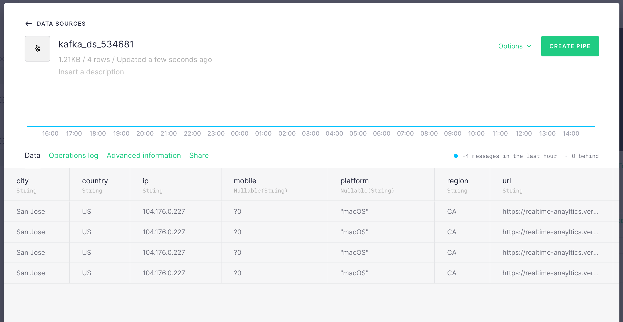 You should see the number of page view from cities in last 15 minutes. The good thing with TinyBird is you can chain queries (new transformation node) also you can add multiple data sources (e.g. Kafka topics) and join them in a single query.