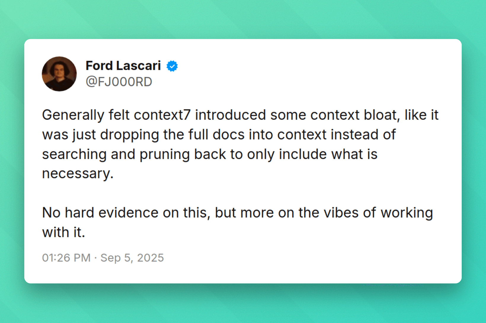 Judging from feedback, especially on Twitter, context bloat is the number 1 issue that holds people back from using Context7. Especially with the explosion of Opus 4.5, an extremely good but expensive model, it's more than enough to use a single or very few pieces of accurate documentation.