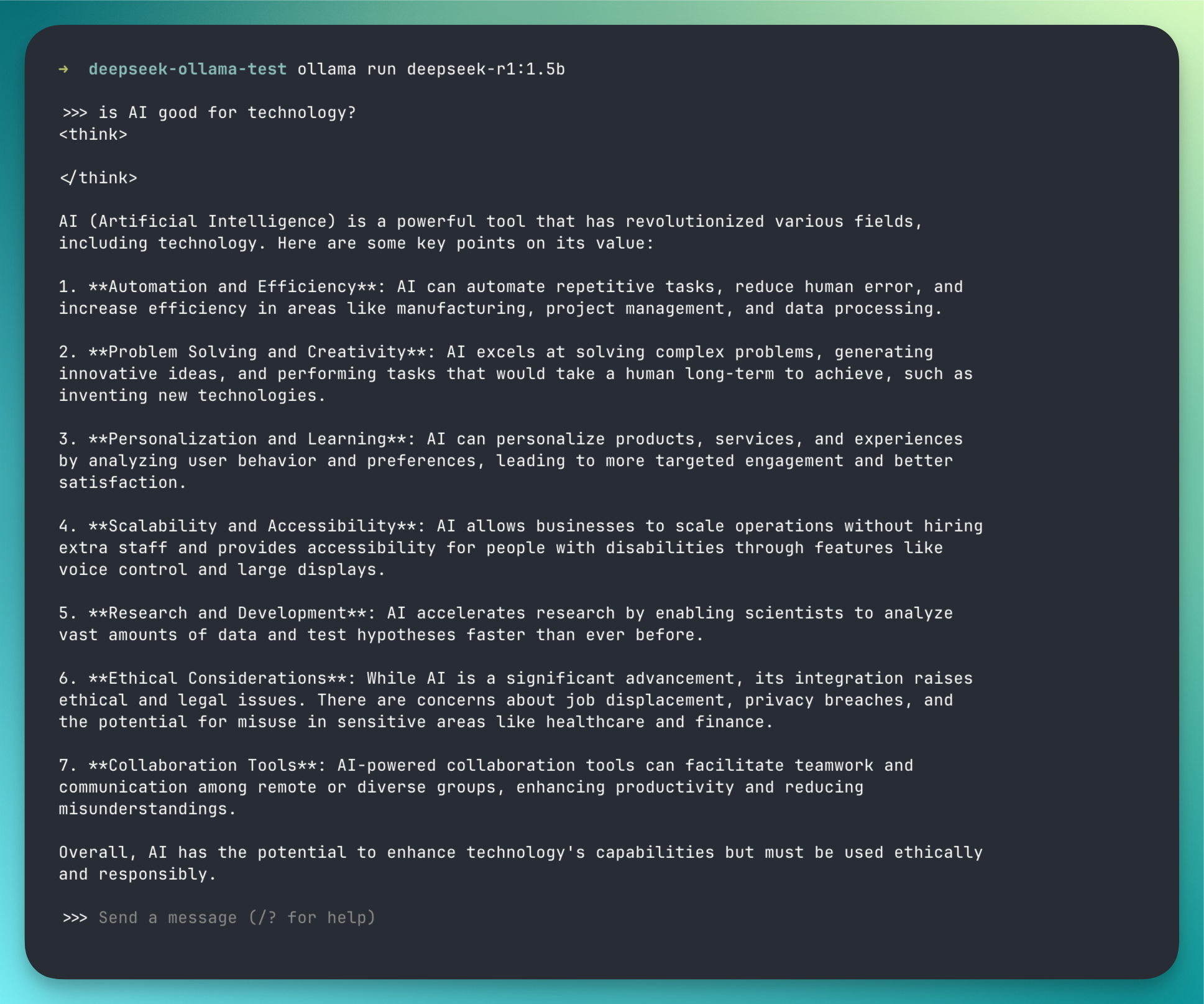 That's it! You have now run Deepseek R1 on your local machine using Ollama. It was easy, right?