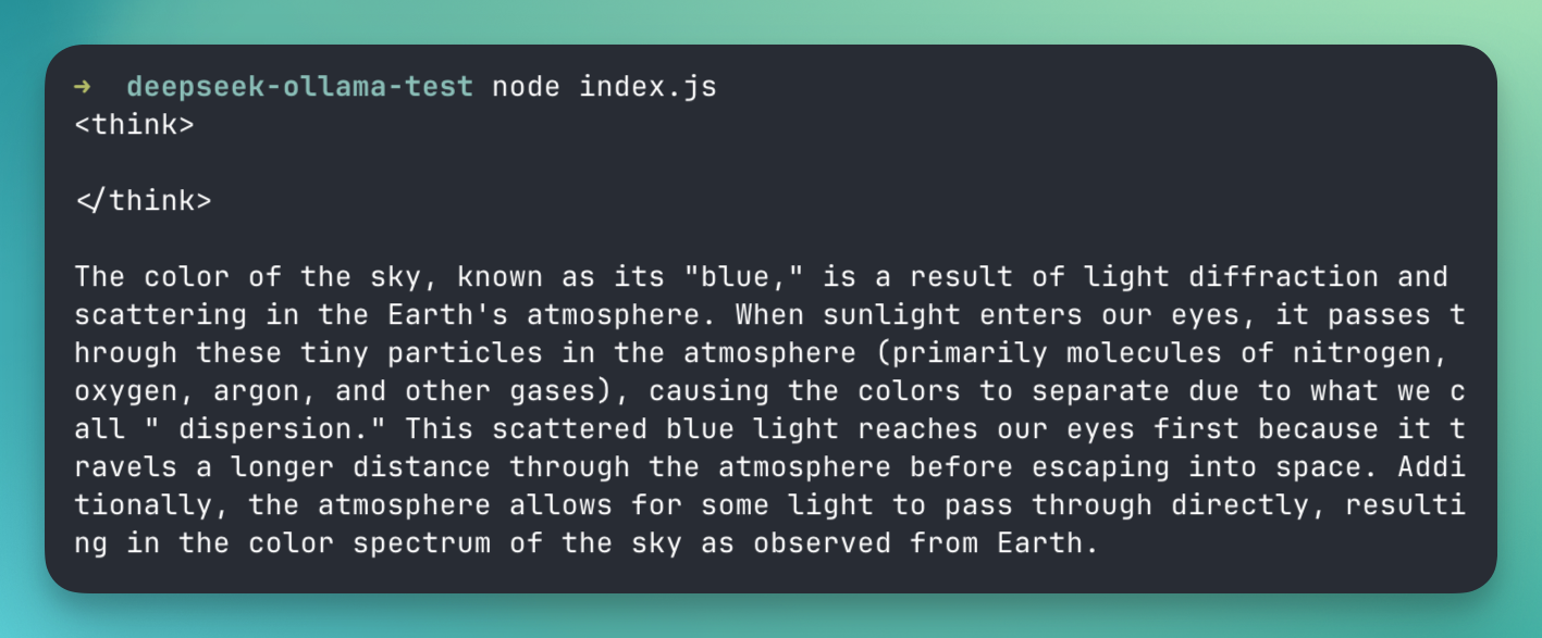 Now, let's run Deepseek R1 in a JavaScript/Node application. First, create a new Node project and install the Ollama client library.