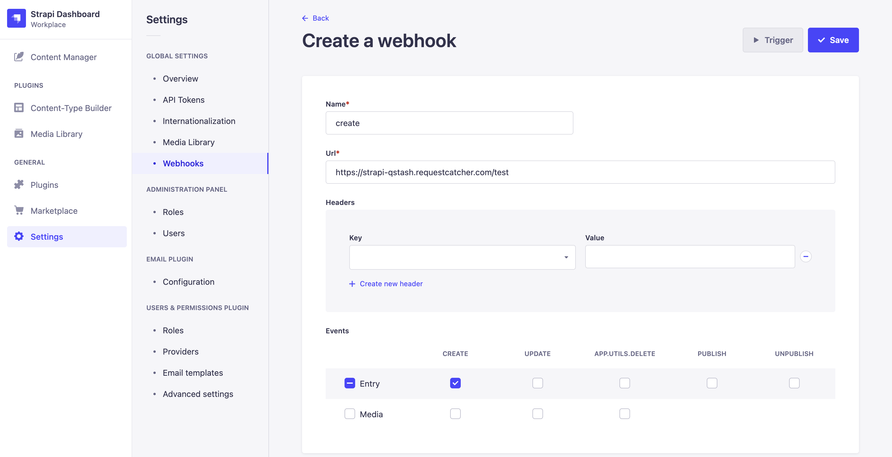 โโโโโโโโโโโโโโโโโโโโโโโโโโโโโโโAfter you have created your admin account, go to http://localhost:1337/admin/settings/webhooks/create and fill in the form to create a webhook.