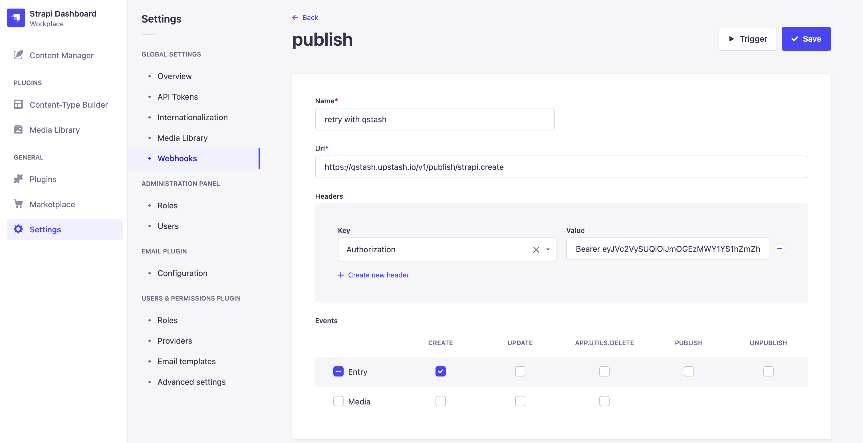 Strapi is now sending the webhook to QStash and using the QSTASH_TOKEN to
