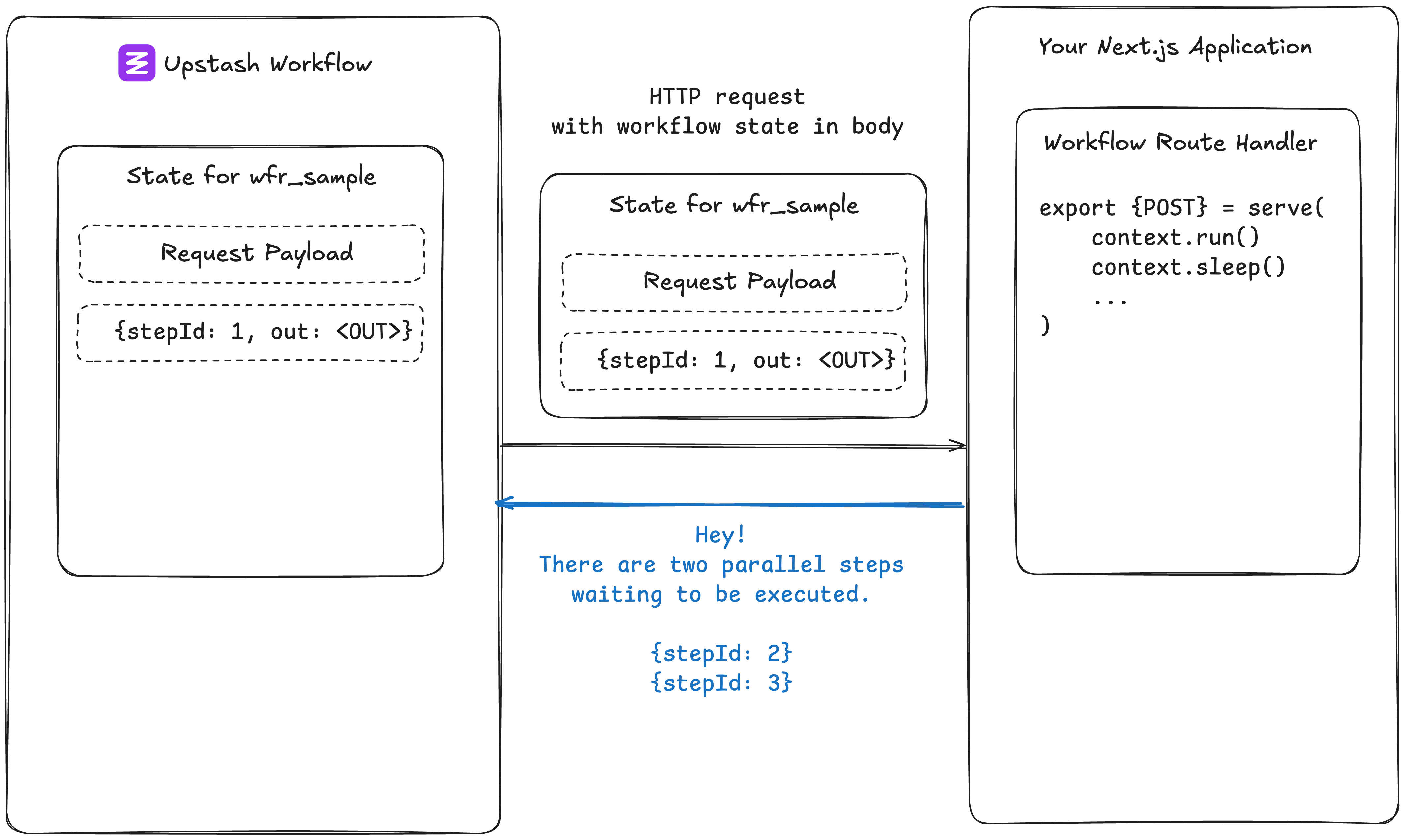 Upstash sees that these steps need to run, and then schedules one HTTP requests per step to your app. Each request shows up with the right context and executes just that one step. When all of them finish, Upstash picks up the next sequential step in the workflow.