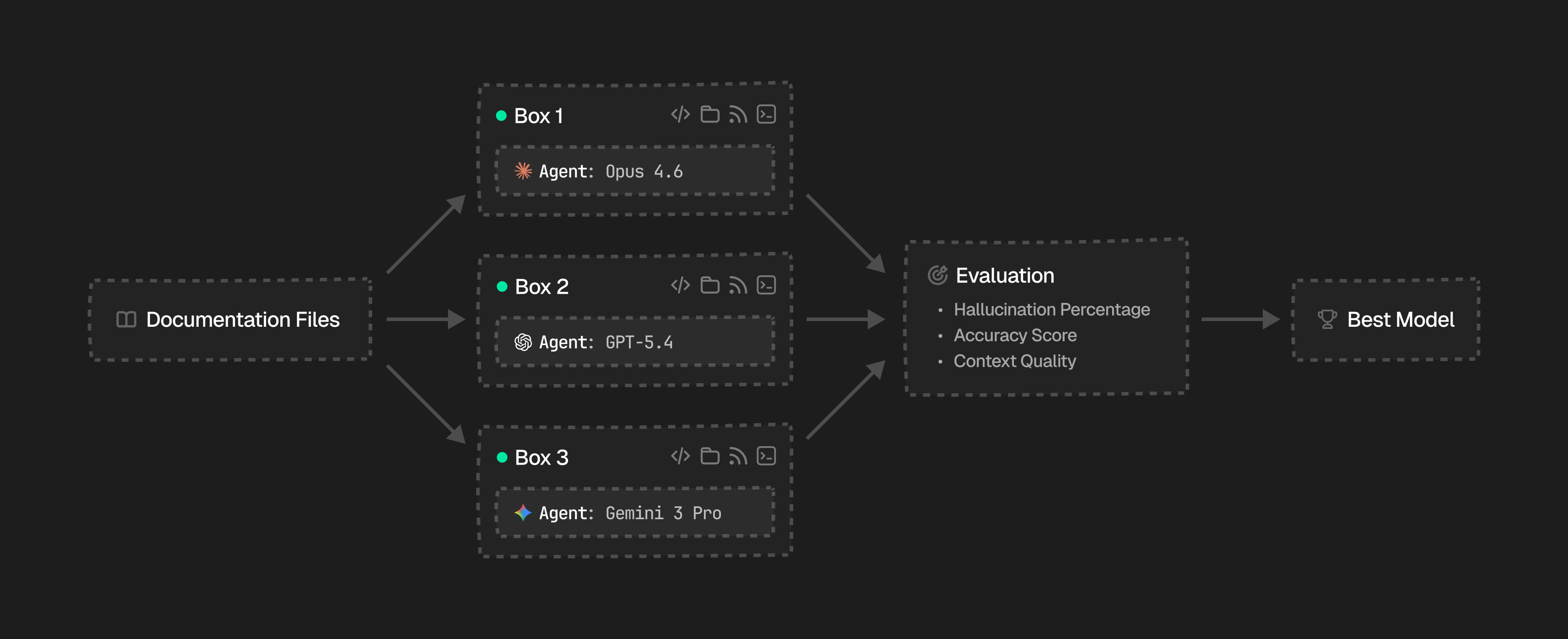 Box makes it easy to run parallel test scenarios at scale. Spin up N boxes, each running a different model against the same inputs, and compare the results side by side.